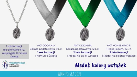 Po co najmniej rocznej formacji, przyjęciu I Komunii Świętej i ukończeniu 9 roku życia (3 klasa szkoły podstawowej), aby stać się członkiem Wincentyńskiej Młodzieży Maryjnej, składamy Akt Oddania i przyjmujemy Medal na białej wstążce. Po ukończeniu drugiego stopnia oraz 12 roku życia uroczyście odnawiamy Akt Oddania, przyjmując Medal na zielonej wstążce (Statut WMM w Polsce §12).