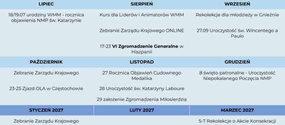 Poniżej znajdują się ogólnie informacje dotyczące wydarzeń oraz ważnych świąt dla WMM i Rodziny Wincentyńskiej. Zostały umieszczone wydarzenia organizowane przez Zarząd Krajowy oraz takie, w który uczestniczą nasze grupy lokalne. W większości przypadków nie ma podanych dat i szczegółów zapisów.